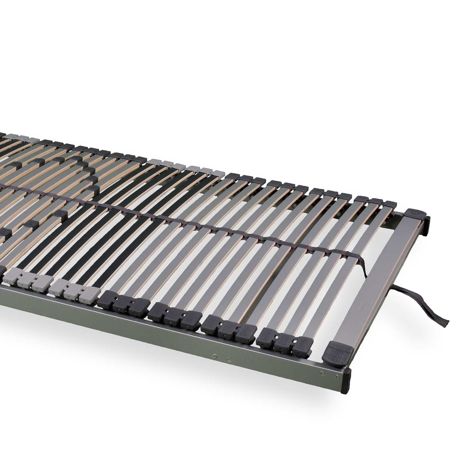 44 mehrfach verleimte Federleisten, ummantelt, Schulterkomfortzone, Trio-Kautschukkappen, Duo-Leisten mit Härtegradschieber zur Unterstützung im Lordose- und Beckenbereich, Mittelgurt, nicht verstellbar